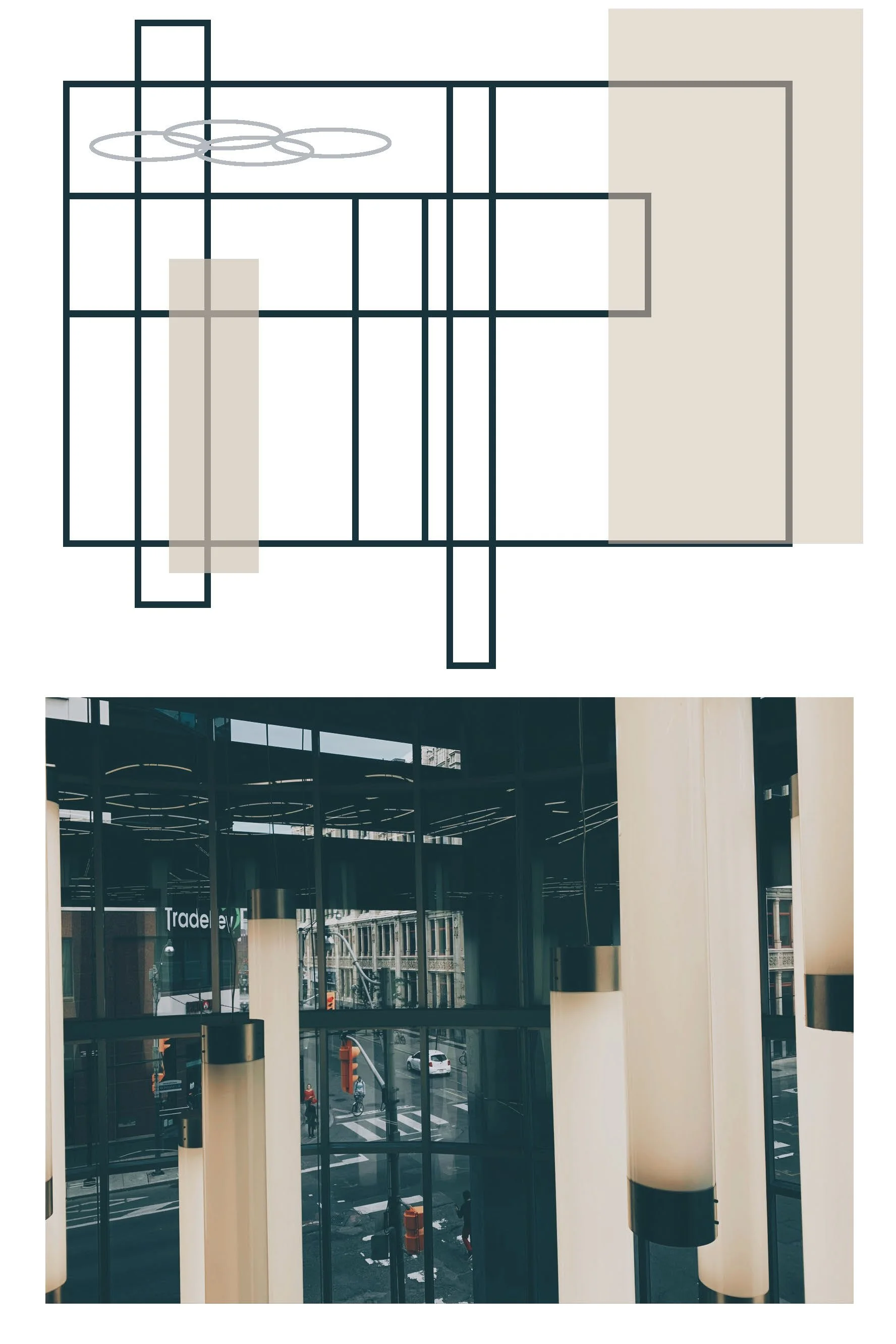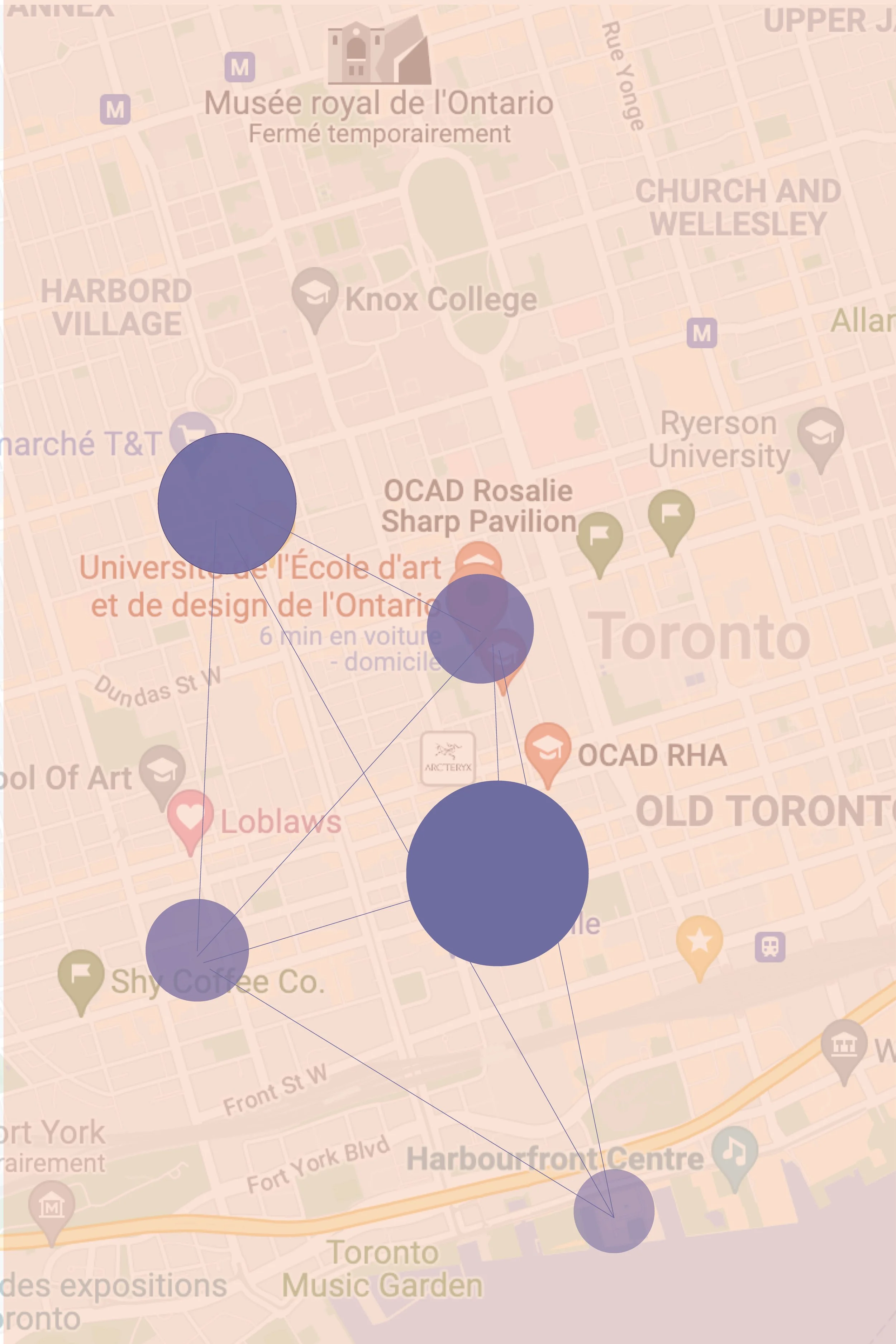 This work visualizes my daily activity and behavioral patterns during COVID-19 through abstract forms. Circles represent movement and frequency of locations across Toronto, inspired by Google Maps tracking, while rectangles reference window frames and illuminated interiors—contrasting indoor and outdoor spaces.