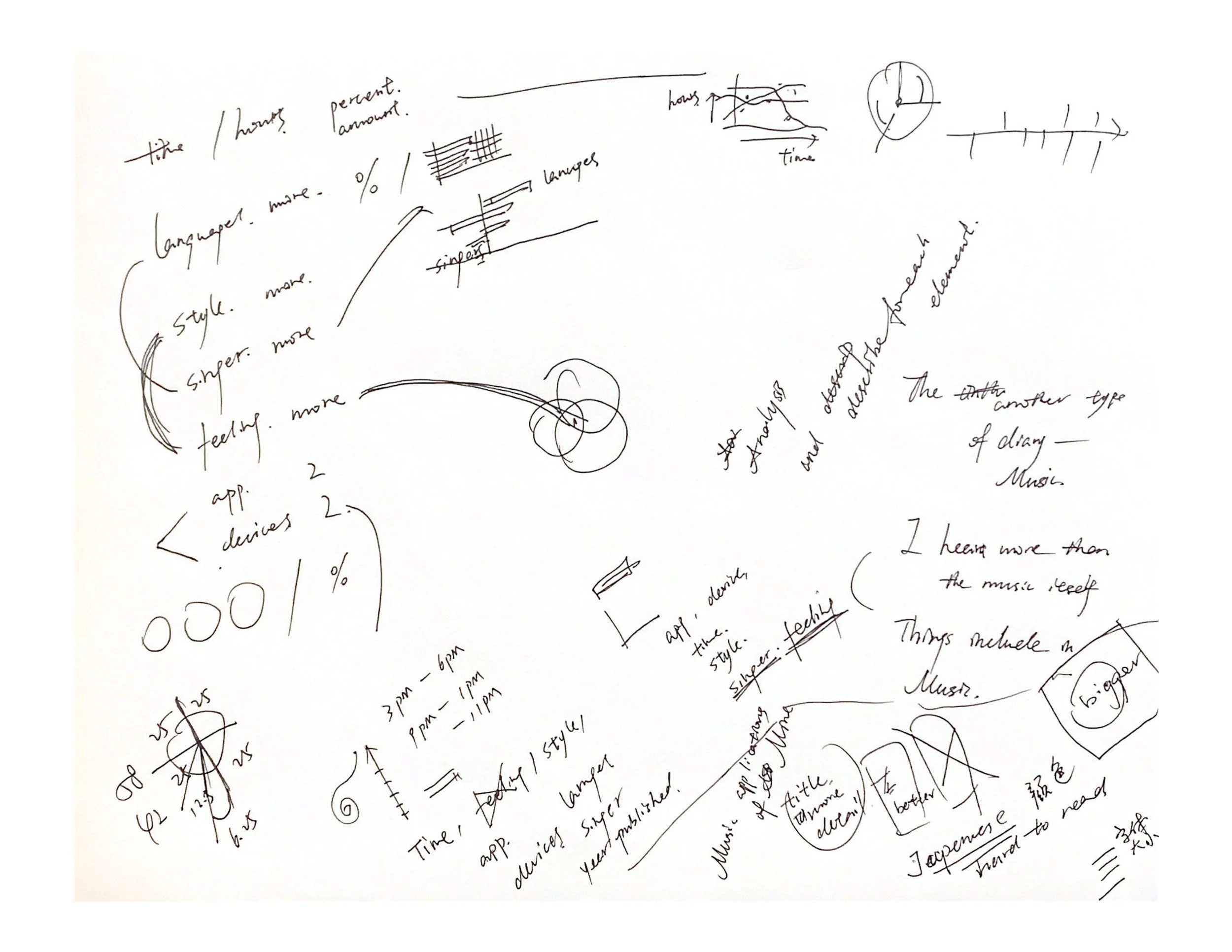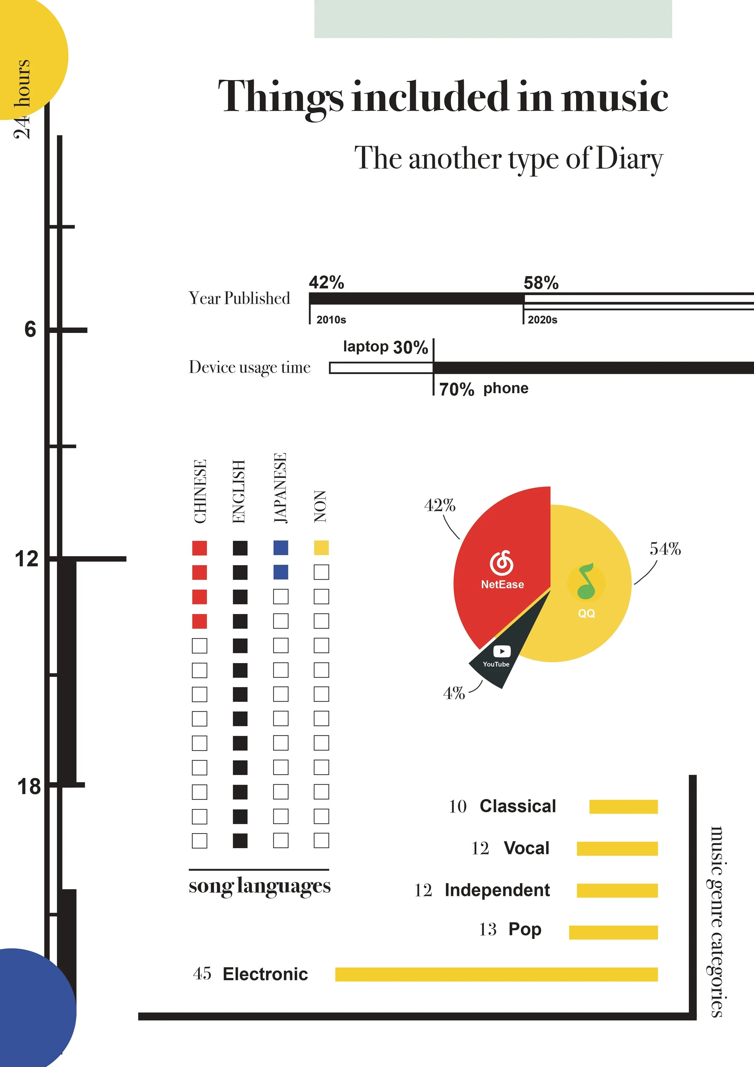 The THINGS INCLUDED IN MUSIC investigates embodiment within digital environments through a structured process of observation and self-directed research. Using auto-ethnographic methods, it documents first-hand interactions with everyday digital tools, translating personal experience into a set of qualitative data points. The collected data is analyzed and explored through visual systems, transforming patterns of behavior, interaction, and perception into clear and engaging data visualizations. The result highlights the relationship between human experience and digital interfaces, positioning design as a tool for both interpretation and communication.