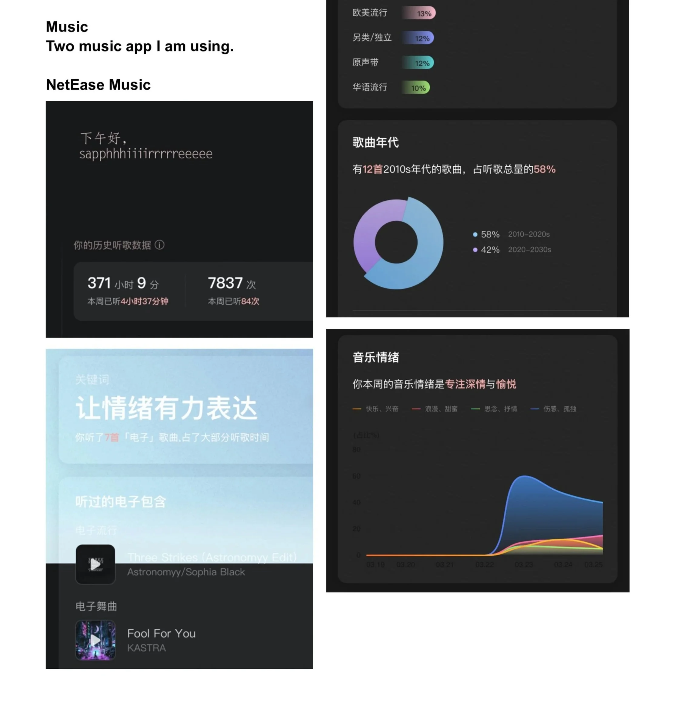 This design process involves collecting and analyzing data from music applications, including usage duration, peak listening periods, and genre preferences. Besides, it also extends beyond data gathering to include data calculation, exploration of charting systems, and the development of a structured poster layout, ensuring a clear and engaging visual translation of the information.